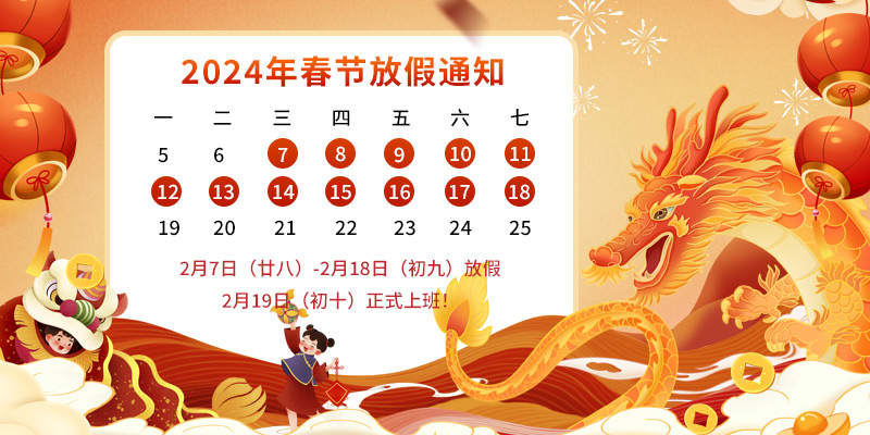 一、放假時間:2024年2月7日(農(nóng)歷臘月廿八)----2024年2月18日(農(nóng)歷正月初九)放假,2024年2月19日(農(nóng)歷正月初十)正式上班。